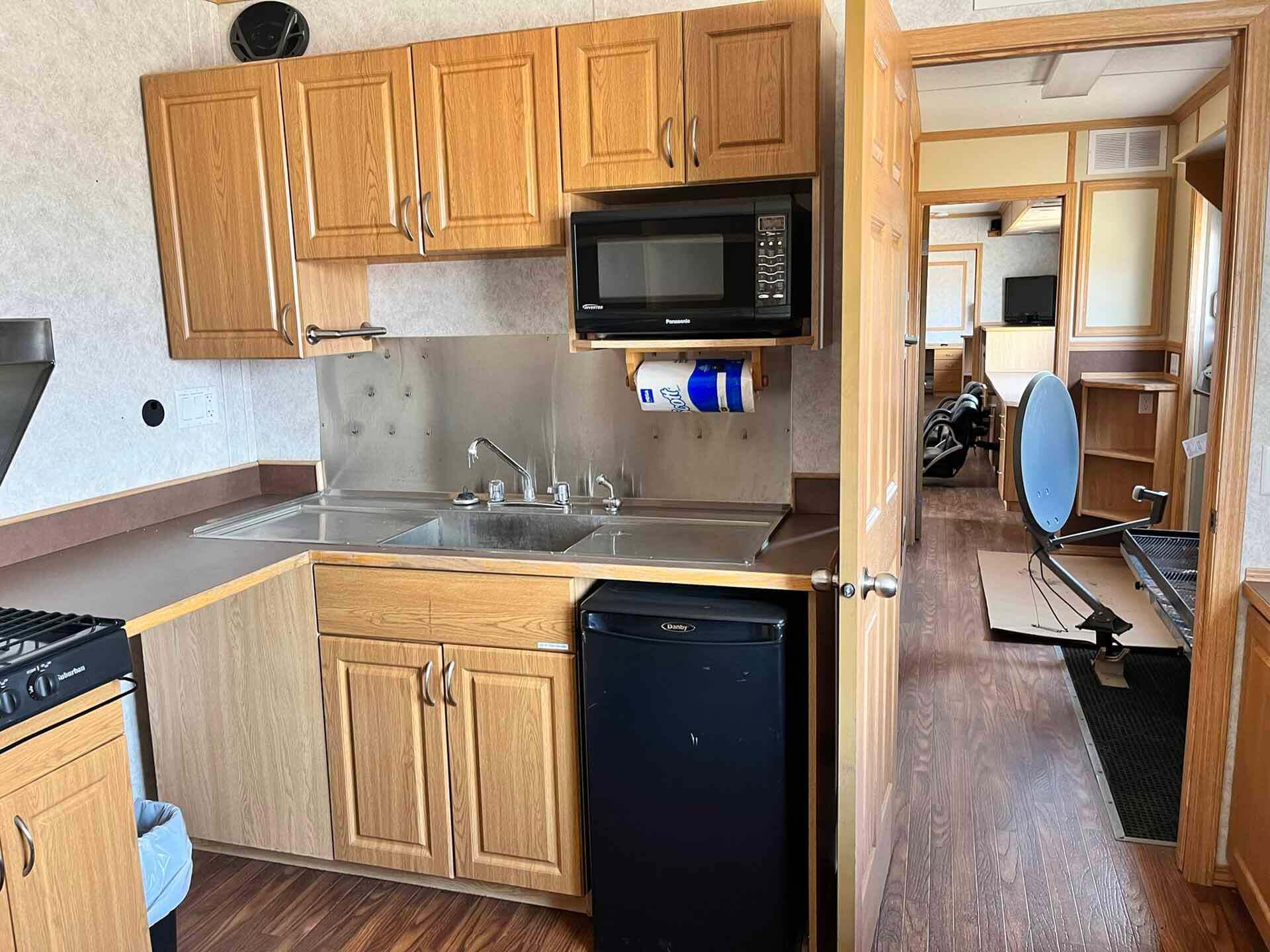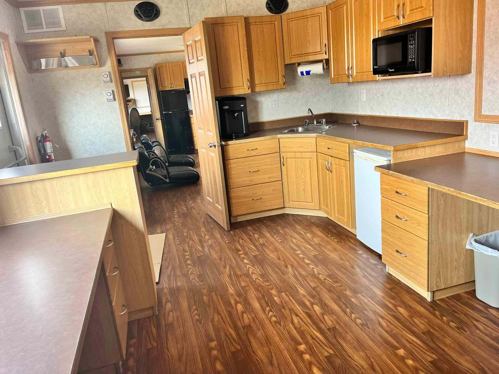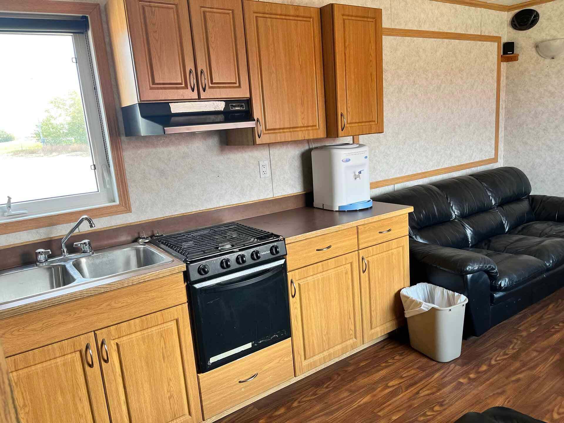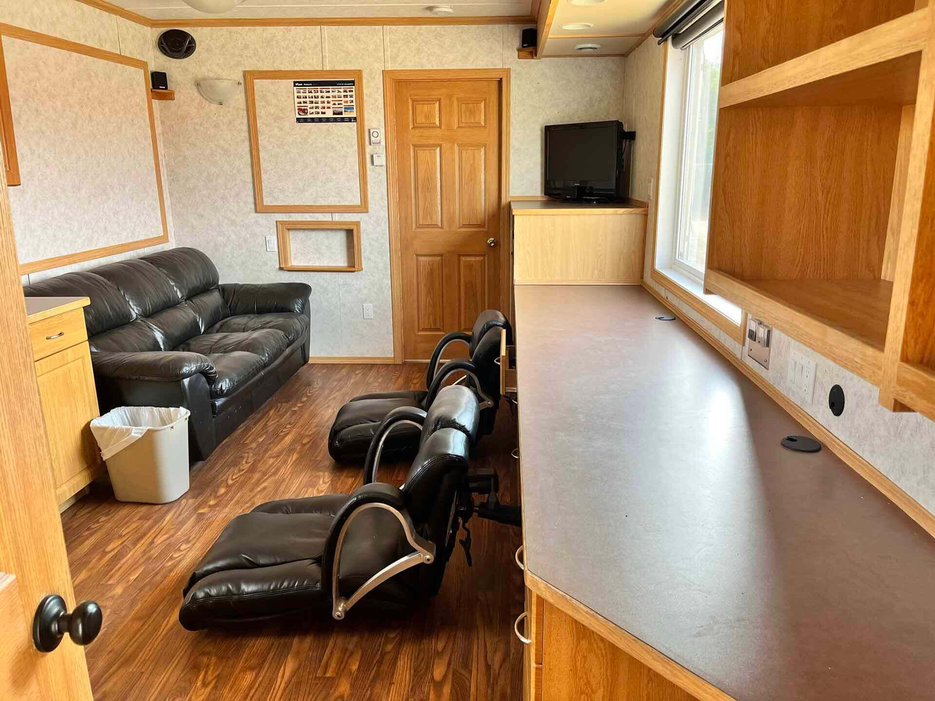 This 2010 portable accommodation trailer shows very well. Three offices, a mechanical room, and a washroom. The mechanical room has 400 gallon fresh water tank, a hot water tank, a water pump furnace, a central vacuum, and a/c. The center office has a kitchenette with fridge, stove/oven, kitchen sink, microwave, and more. This center office has couch. The center office is approximately 17′ long and 12′ wide. The far right office boasts built-in perimeter desks. Bar fridge space with a small sink. This office is approximately 14′ X 12′.