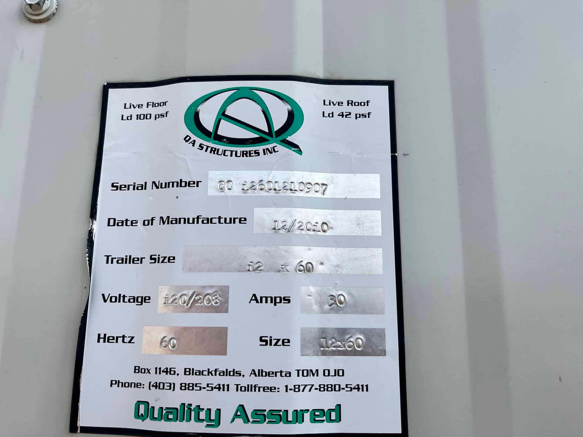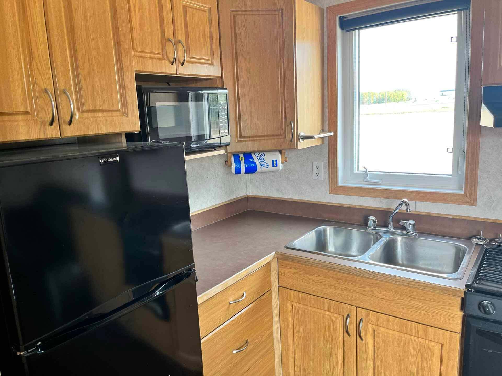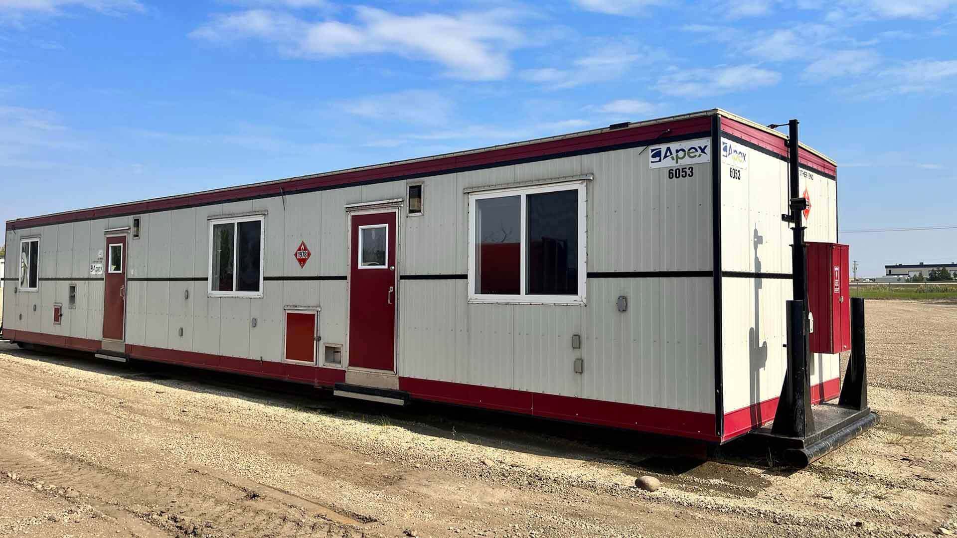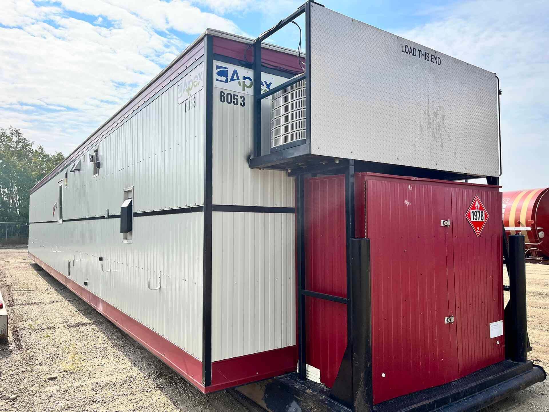 This 2010 portable accommodation trailer shows very well. Three offices, a mechanical room, and a washroom. The mechanical room has 400 gallon fresh water tank, a hot water tank, a water pump furnace, a central vacuum, and a/c. The center office has a kitchenette with fridge, stove/oven, kitchen sink, microwave, and more. This center office has couch. The center office is approximately 17′ long and 12′ wide. The far right office boasts built-in perimeter desks. Bar fridge space with a small sink. This office is approximately 14′ X 12′.