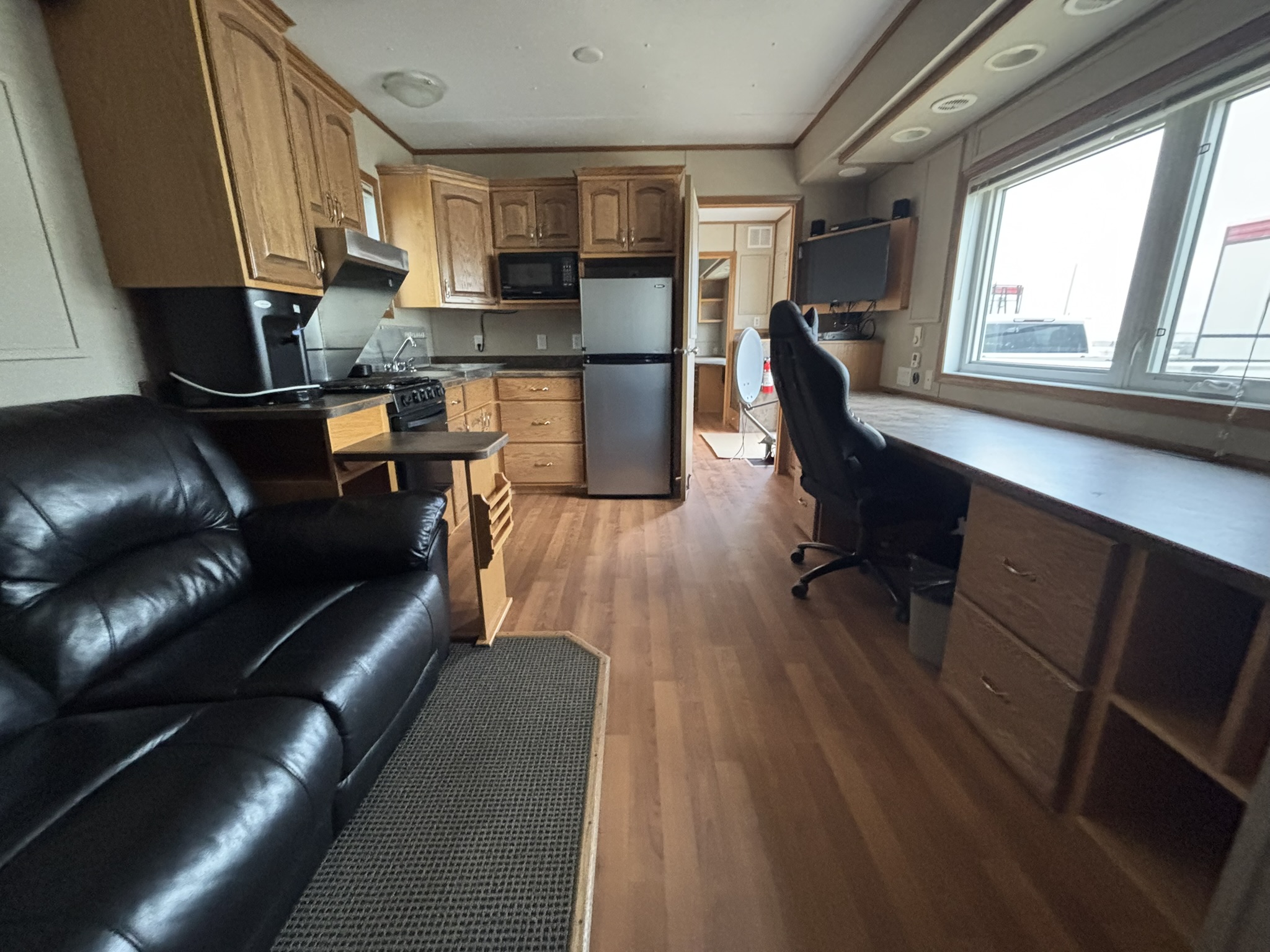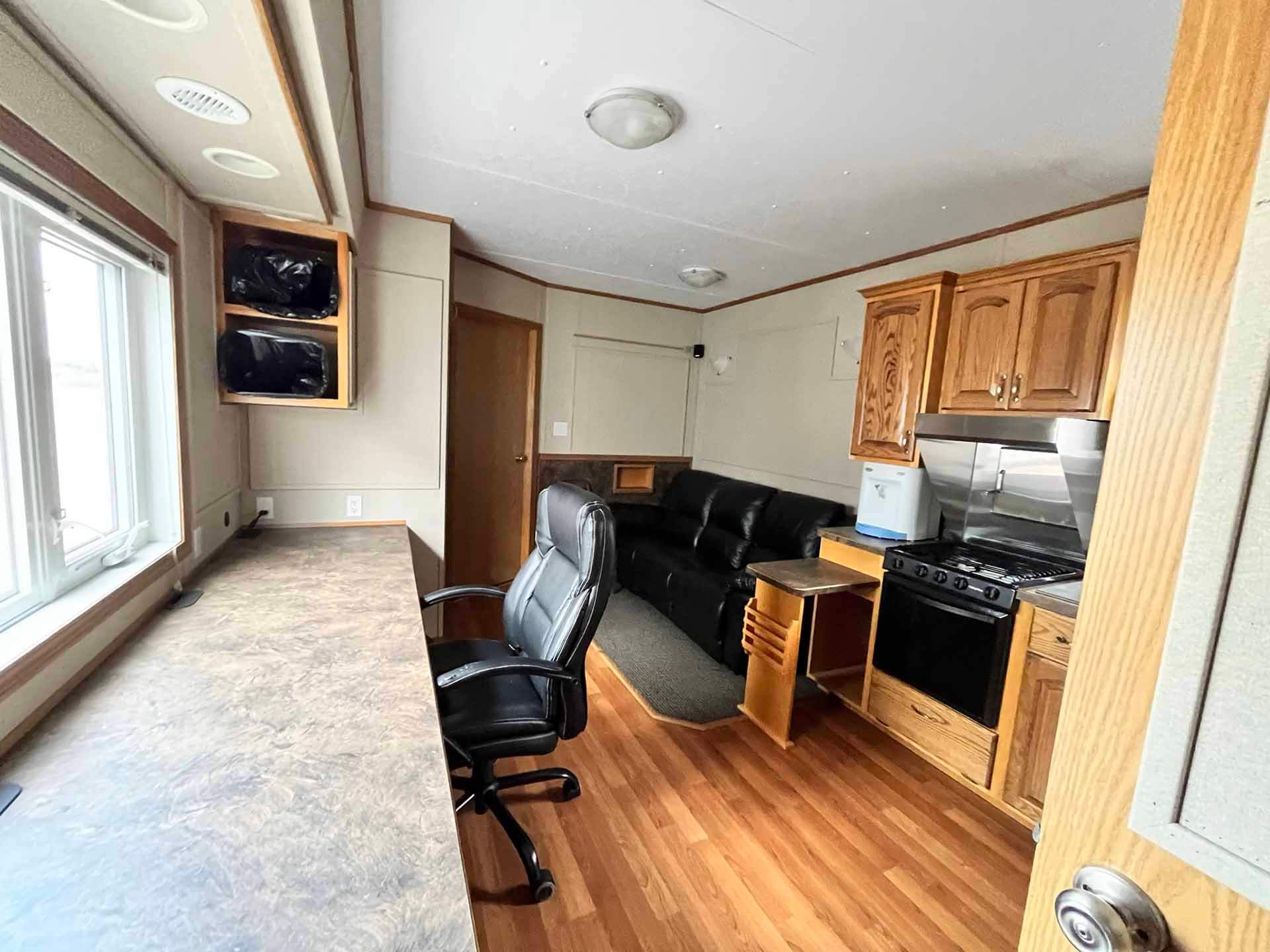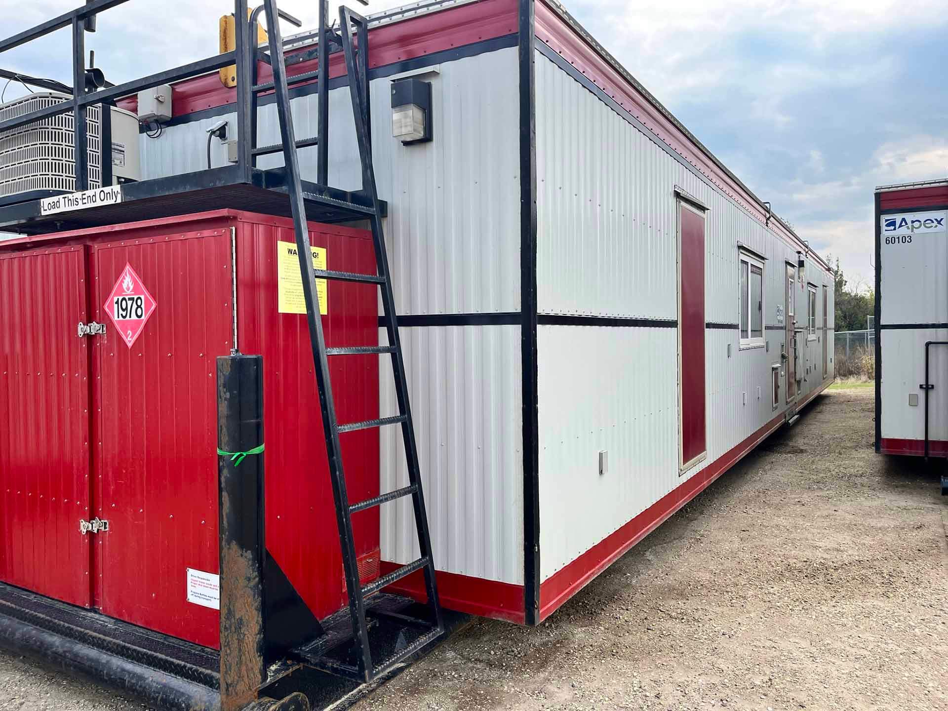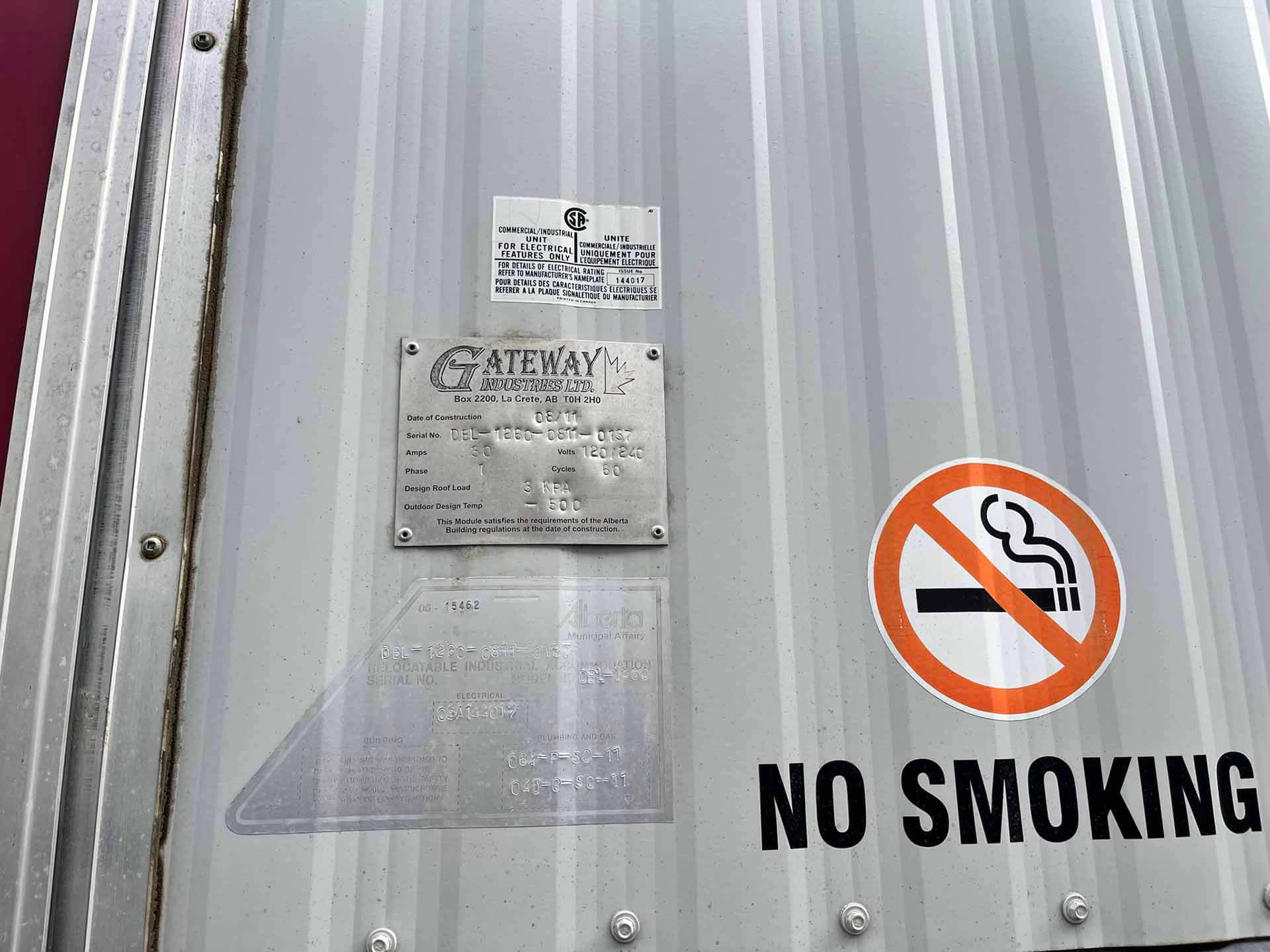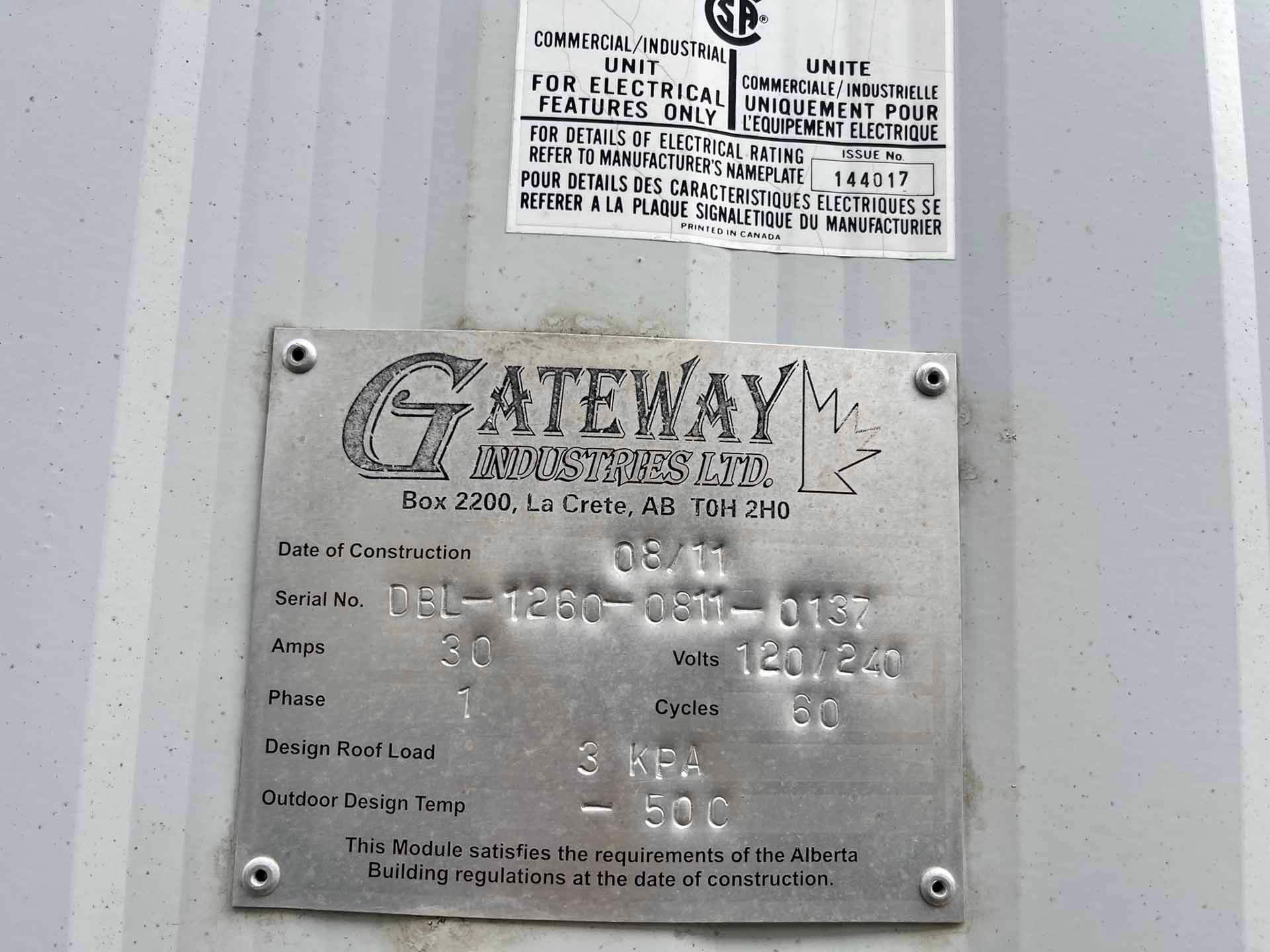 This 2011 “Gateway Portable Accommodation Trailer” shows very well. The mechanical room has 400 gallon fresh water tank, hot water tank, water pump furnace, laundry center, central vacuum and forced air propane furnace with a/c.