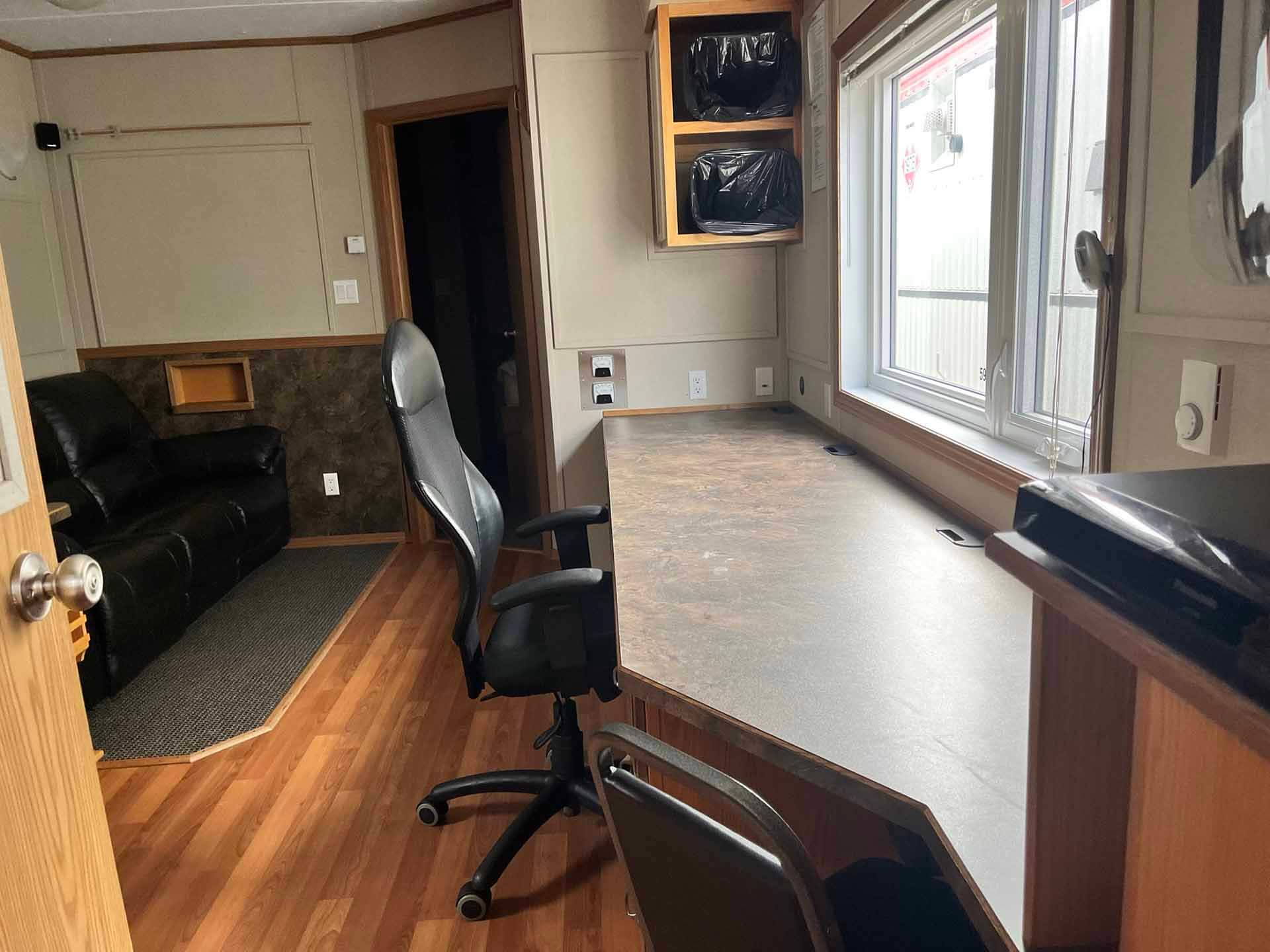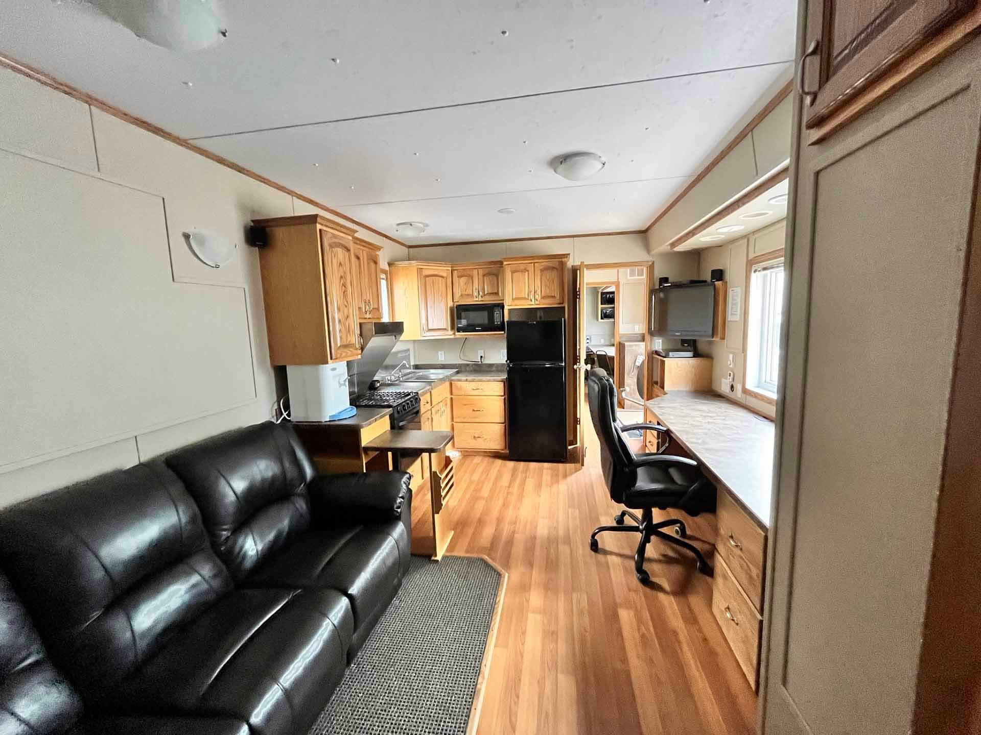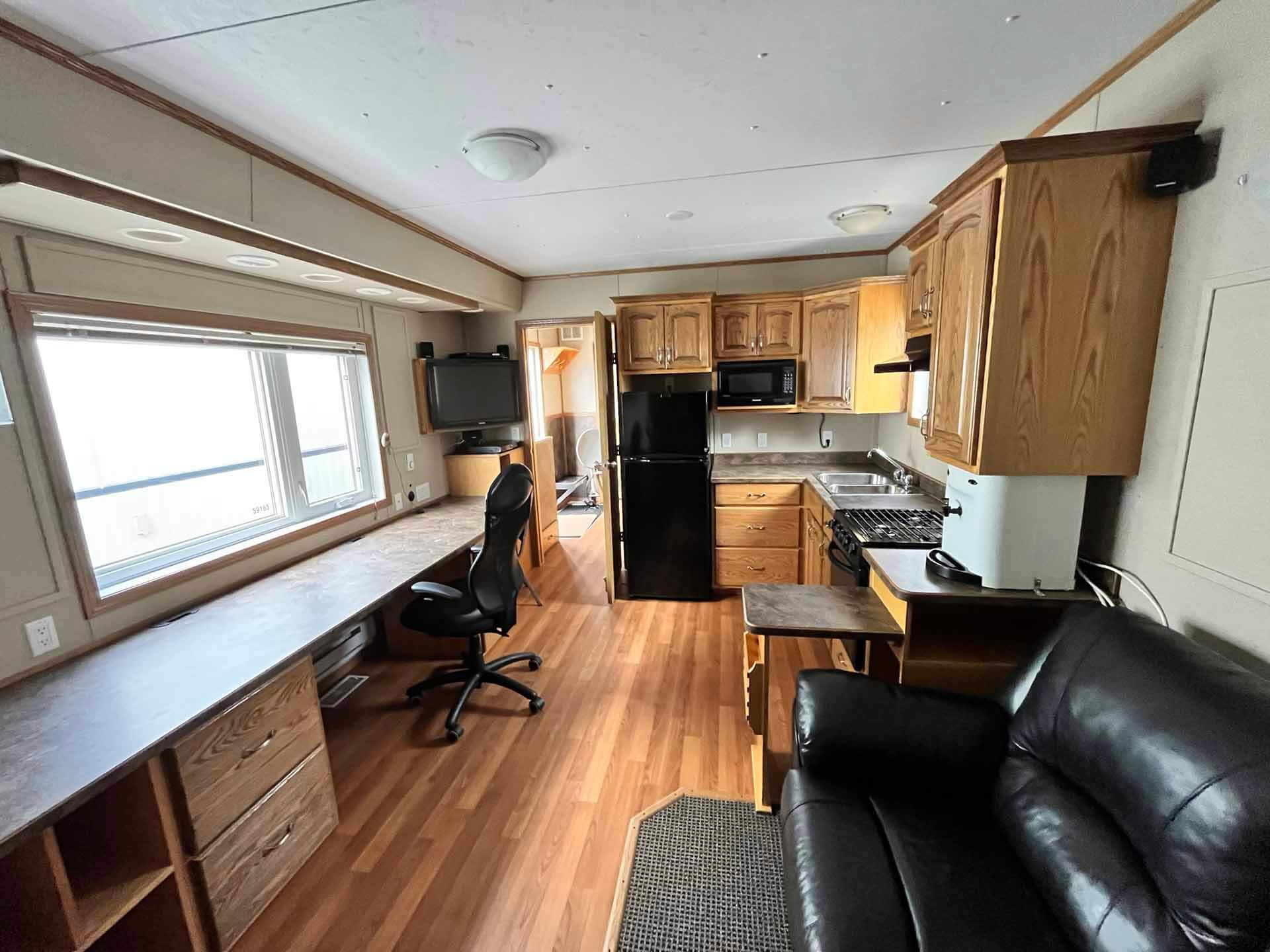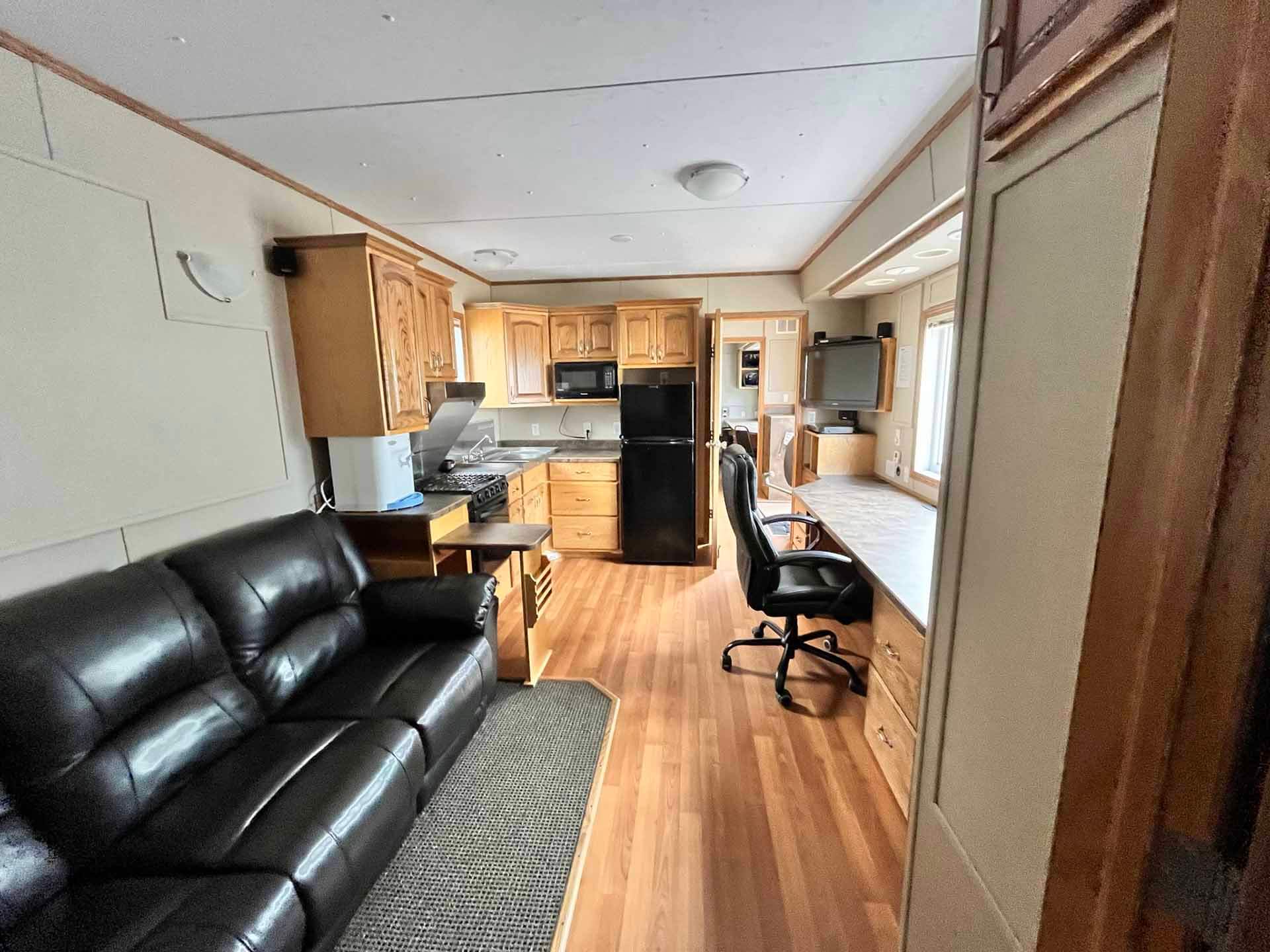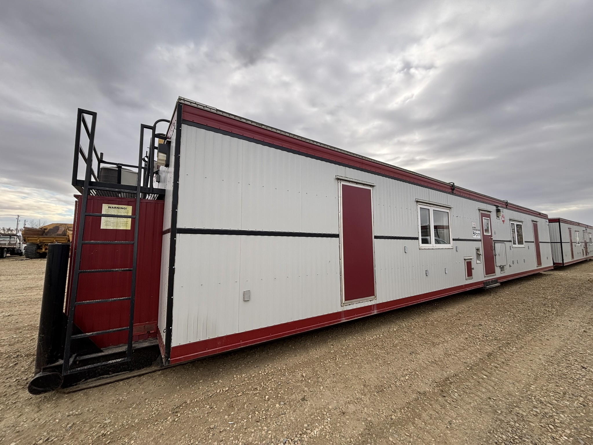 This 2011 “Gateway Portable Accommodation Trailer” shows very well. The mechanical room has 400 gallon fresh water tank, hot water tank, water pump furnace, laundry center, central vacuum and forced air propane furnace with a/c.
