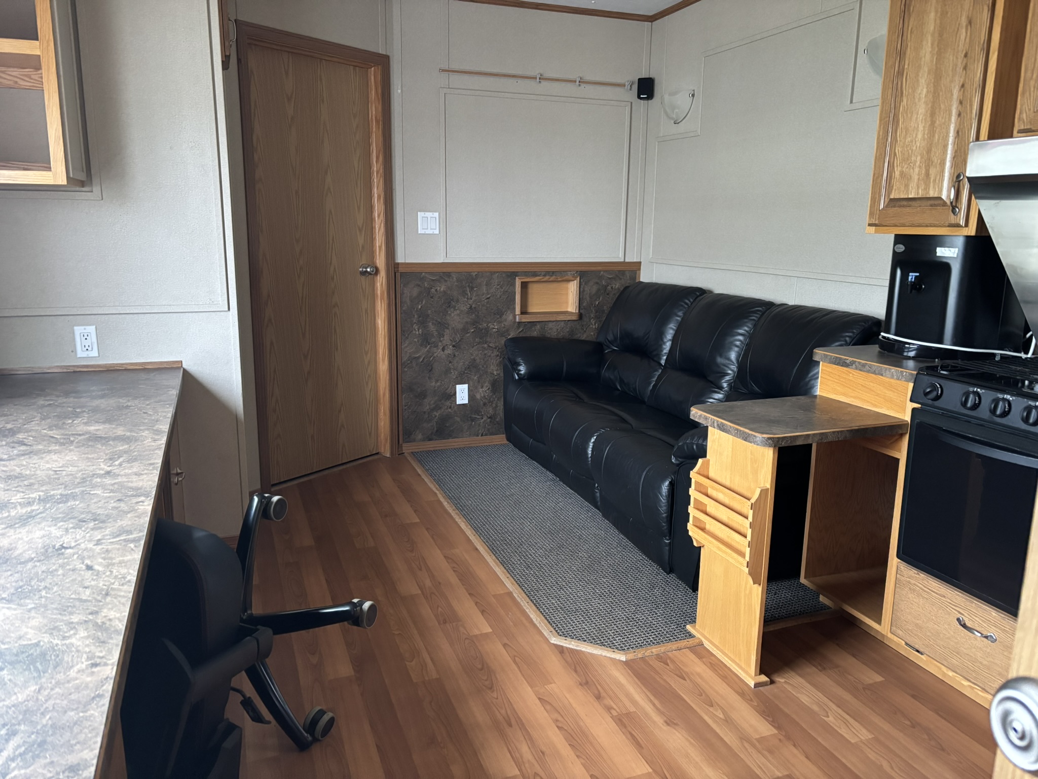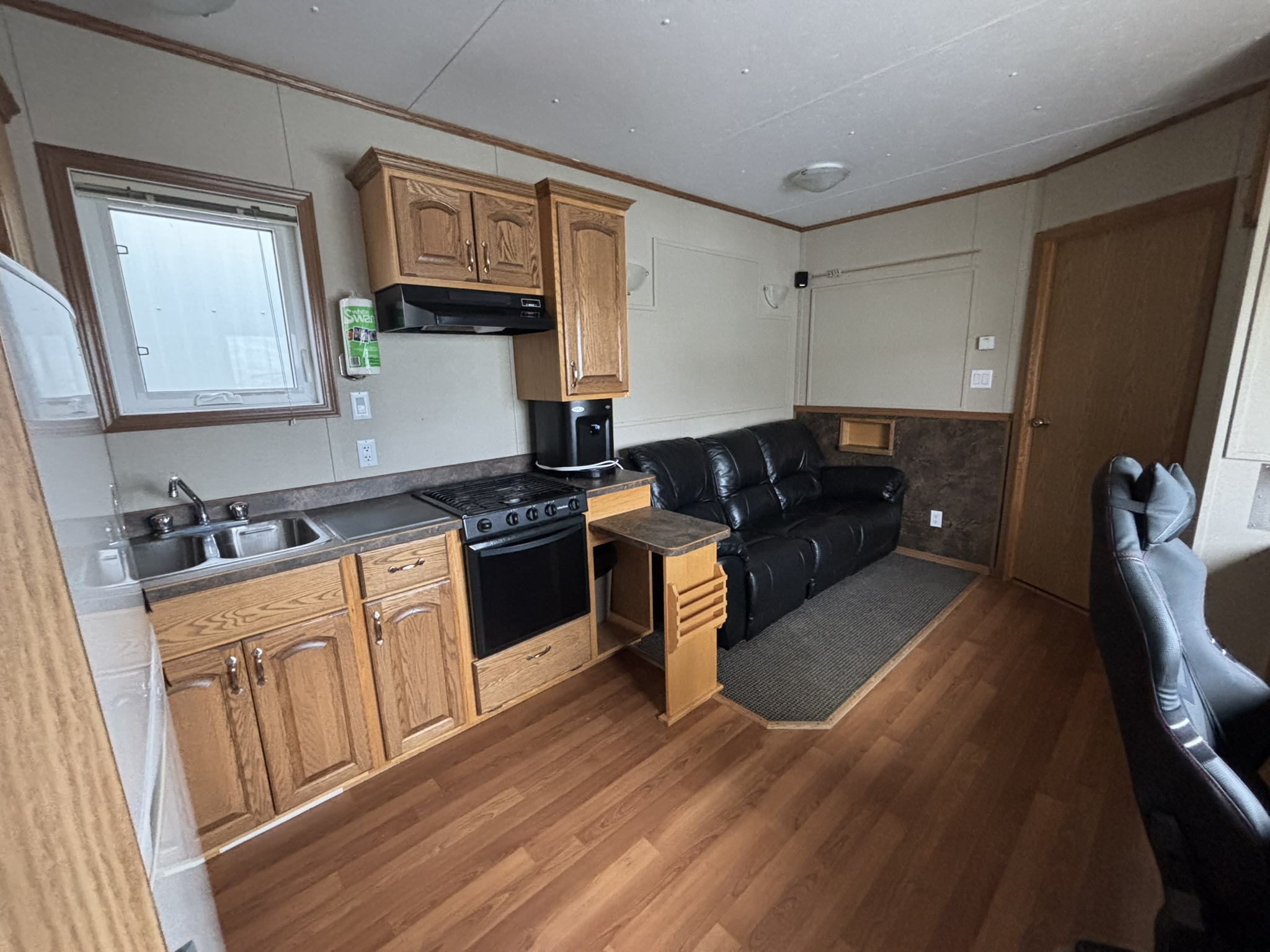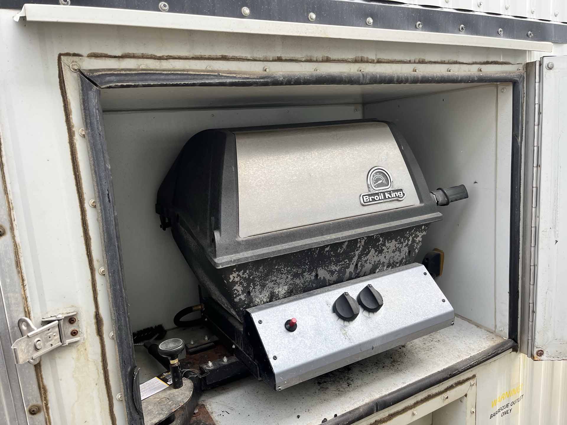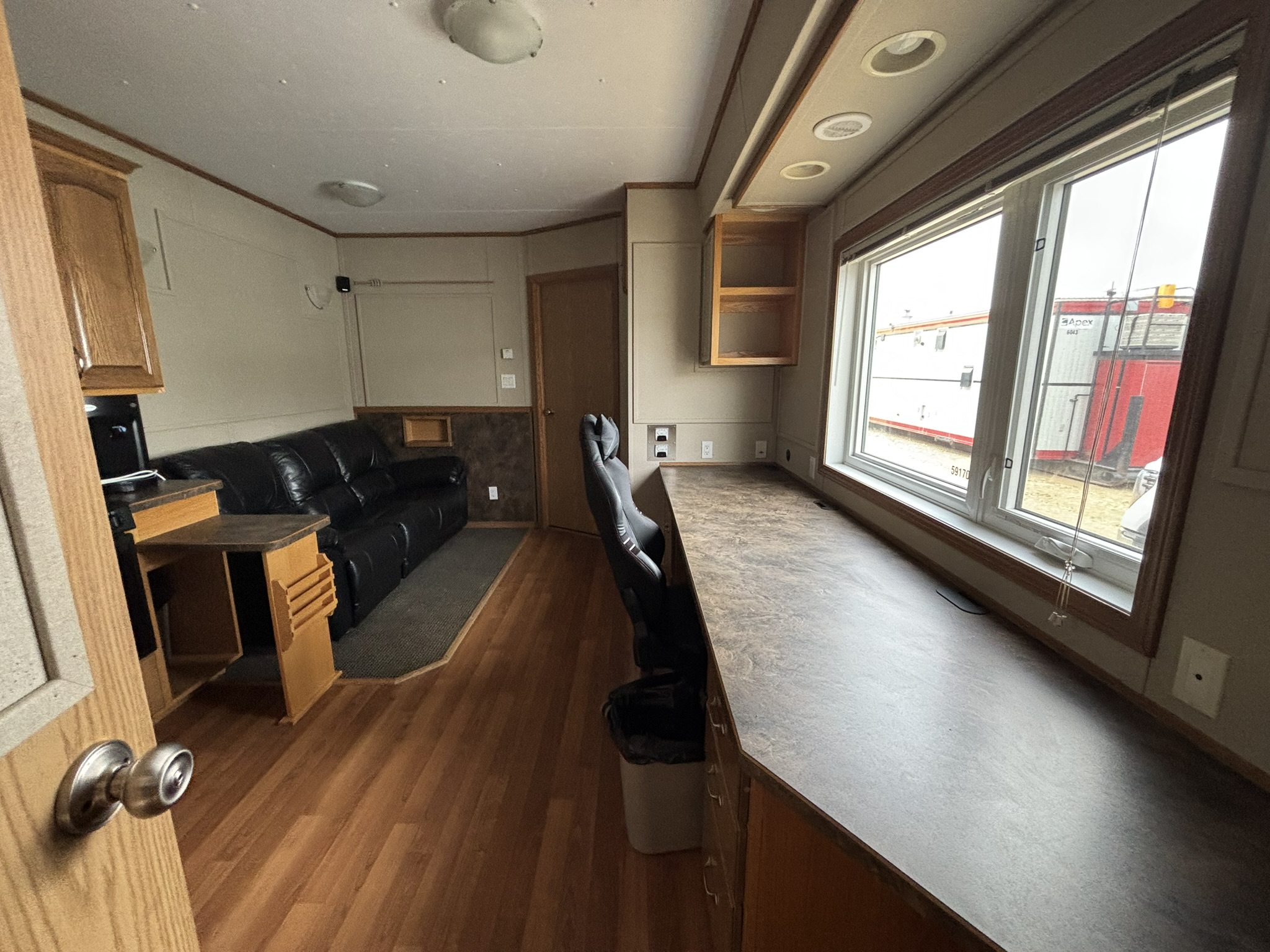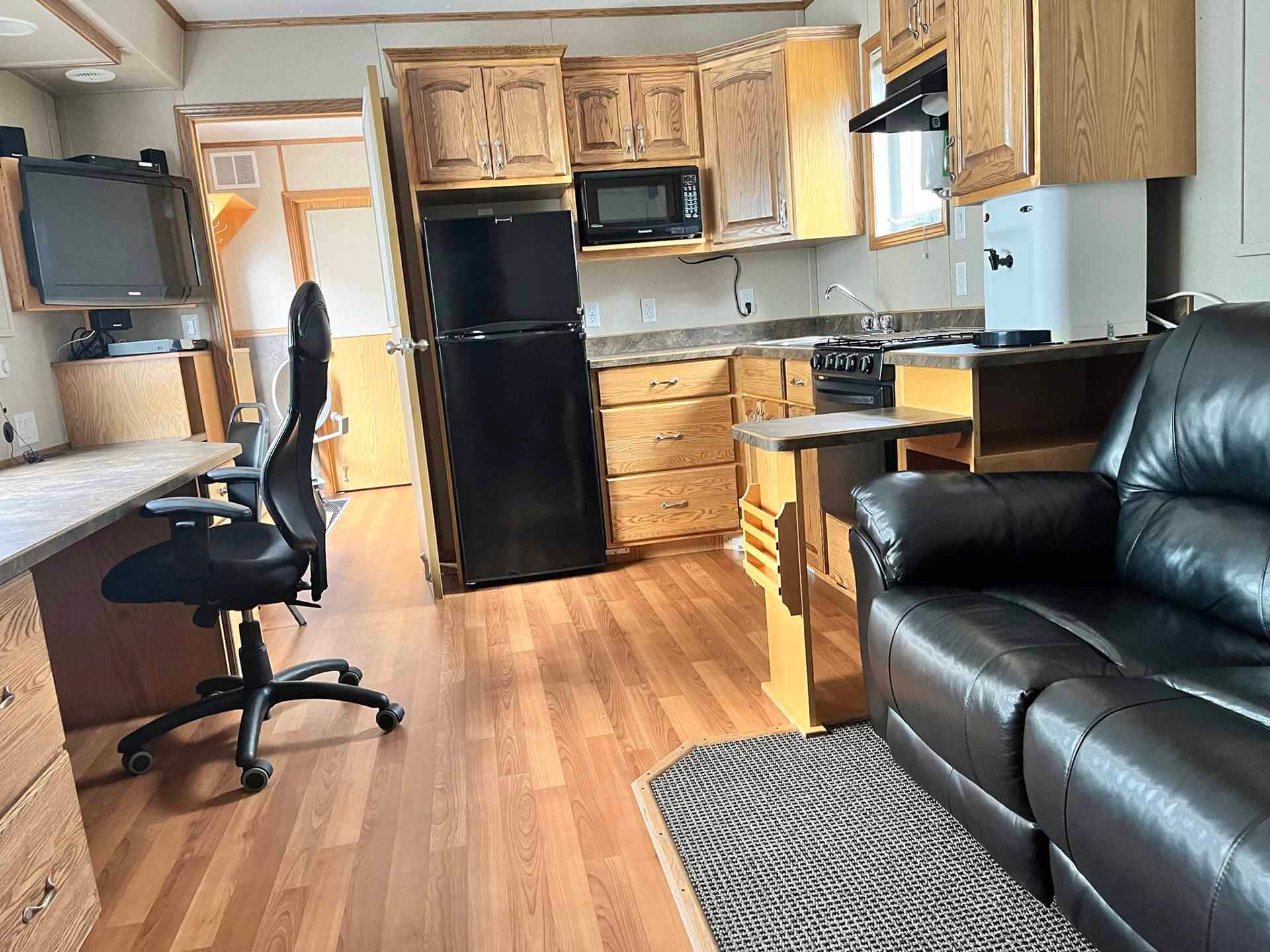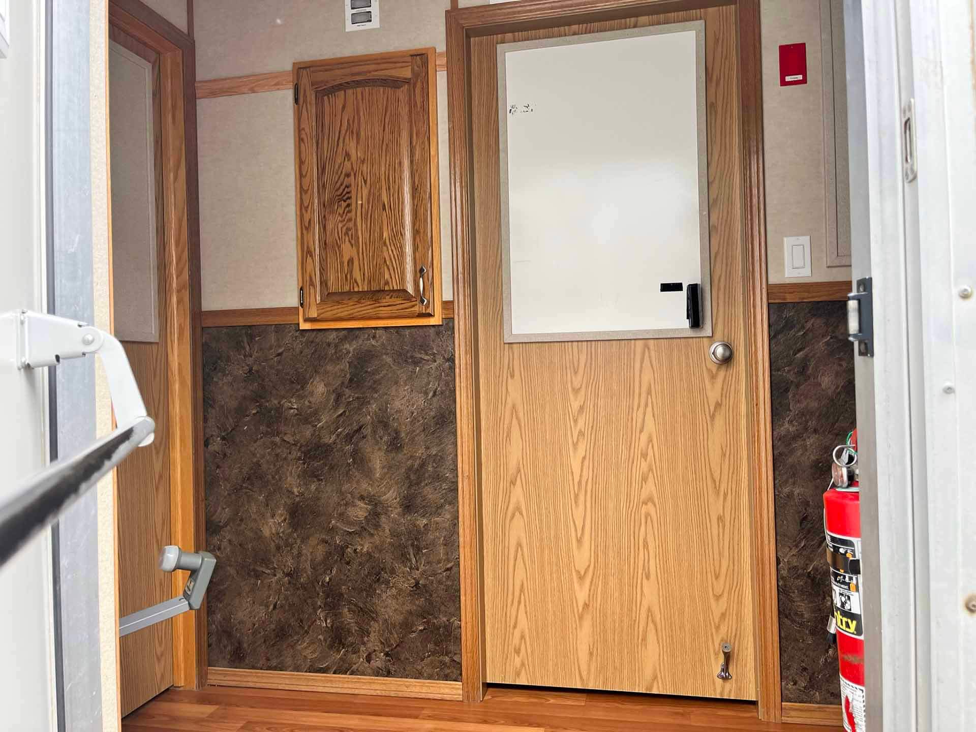 This 2011 “Gateway Portable Accommodation Trailer” shows very well. The mechanical room has 400 gallon fresh water tank, hot water tank, water pump furnace, laundry center, central vacuum and forced air propane furnace with a/c.