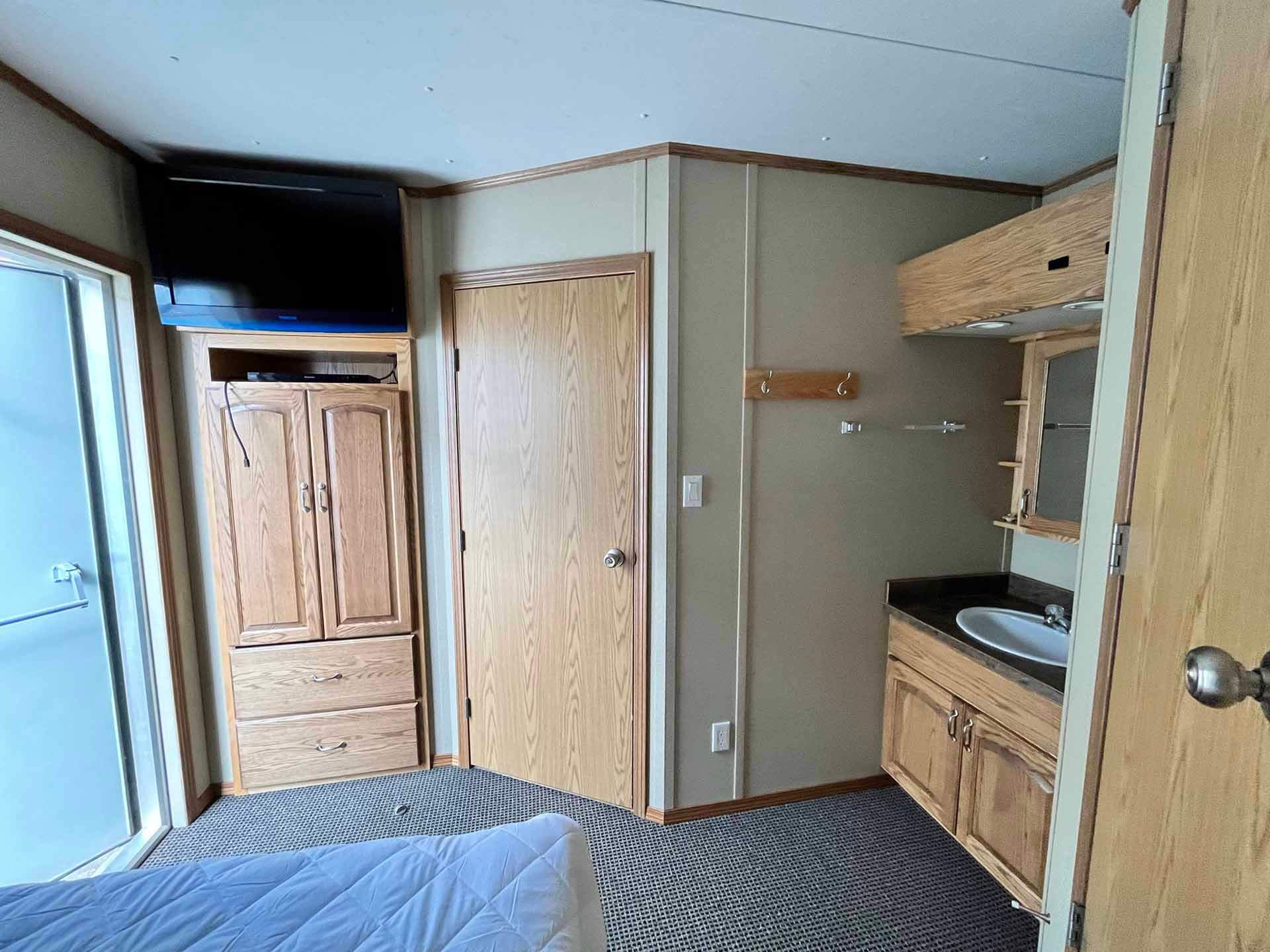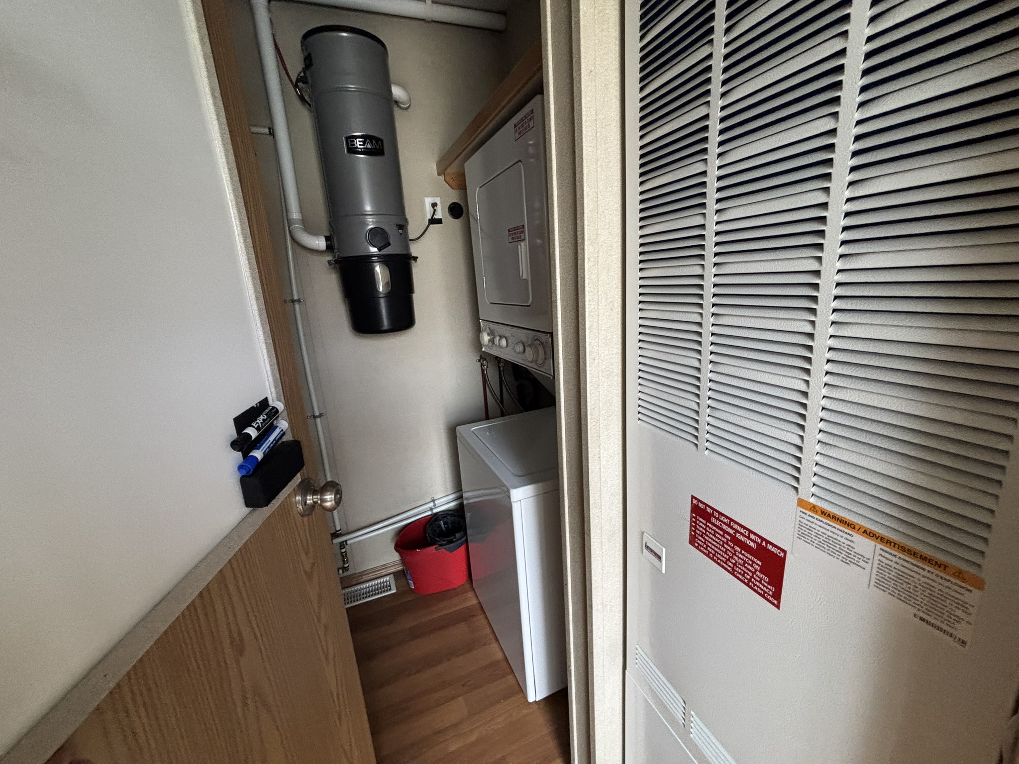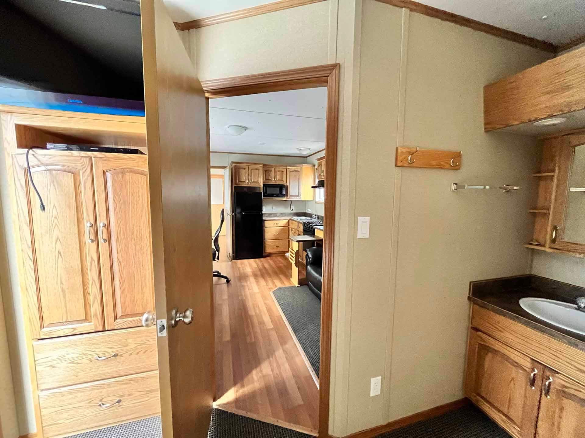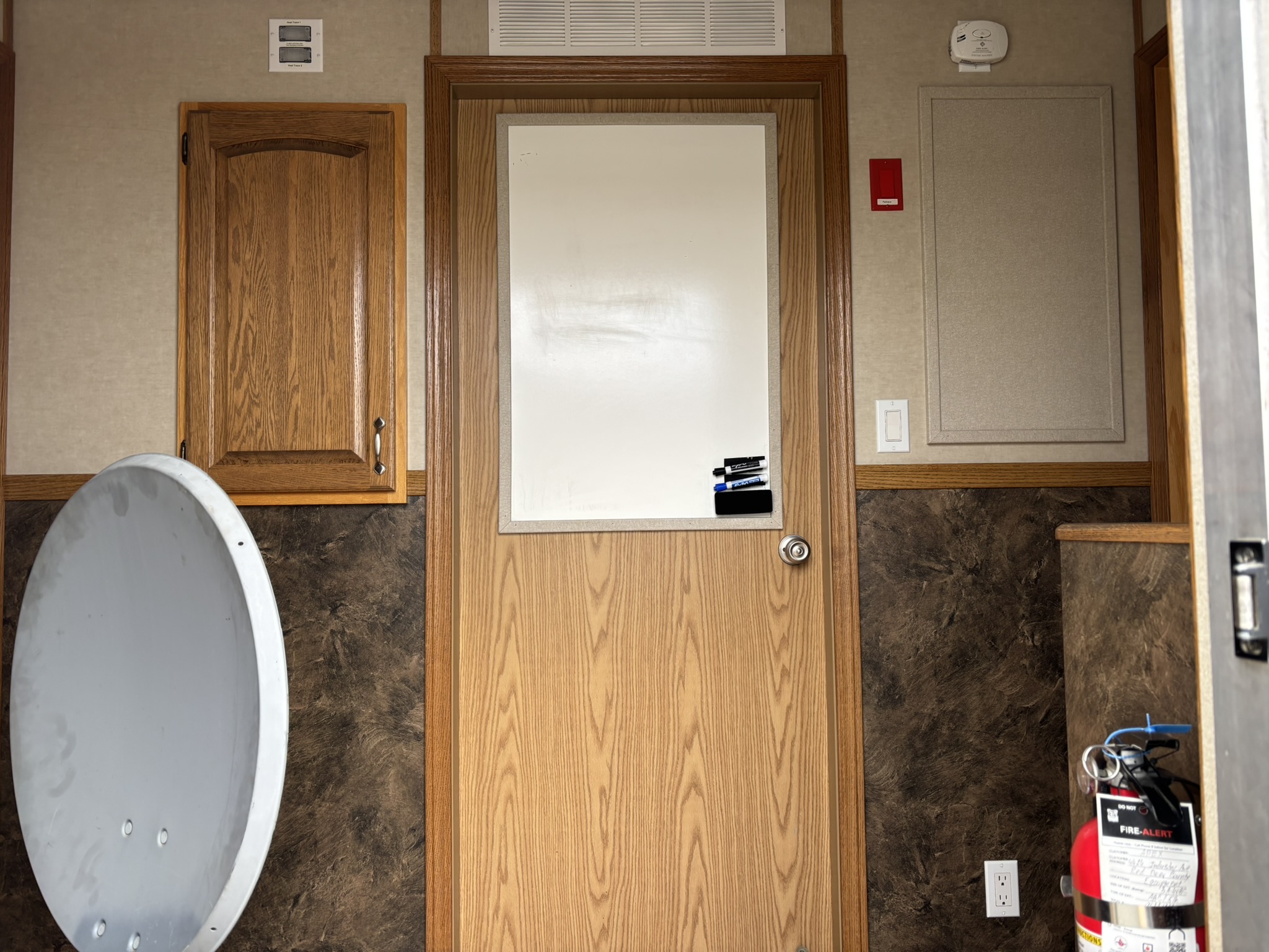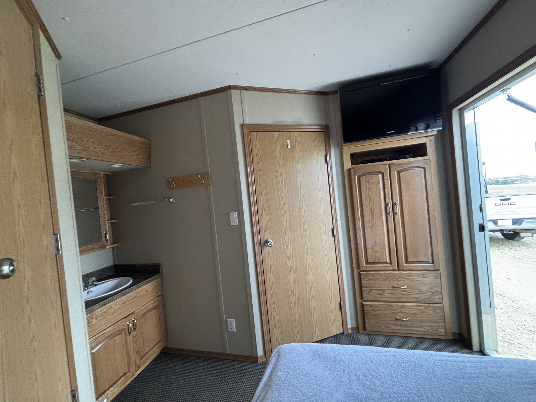 This 2011 “Gateway Portable Accommodation Trailer” shows very well. The mechanical room has 400 gallon fresh water tank, hot water tank, water pump furnace, laundry center, central vacuum and forced air propane furnace with a/c.