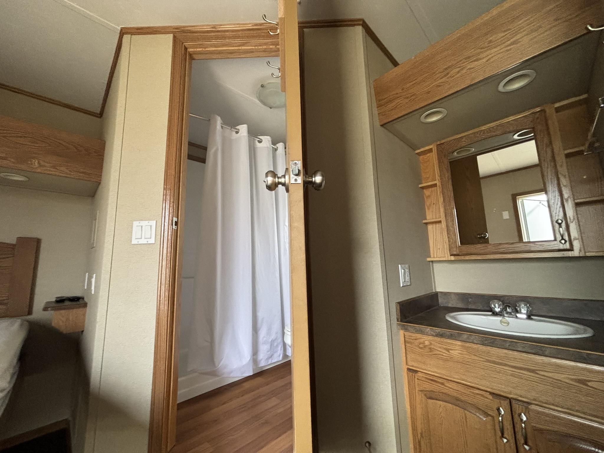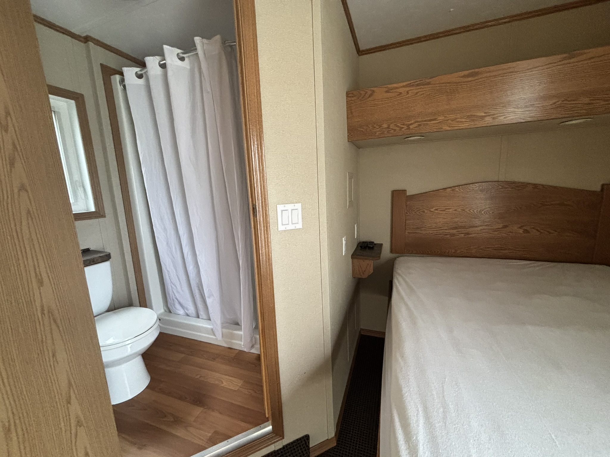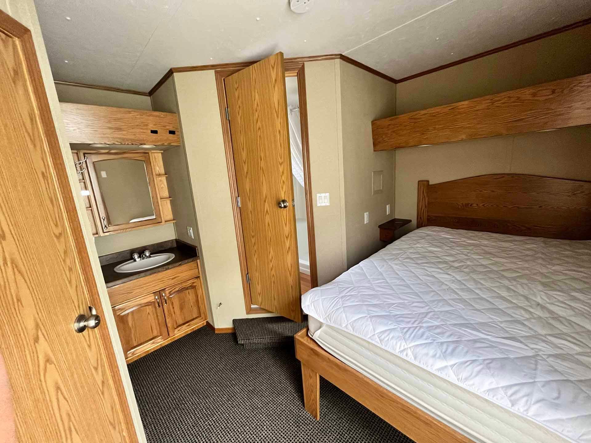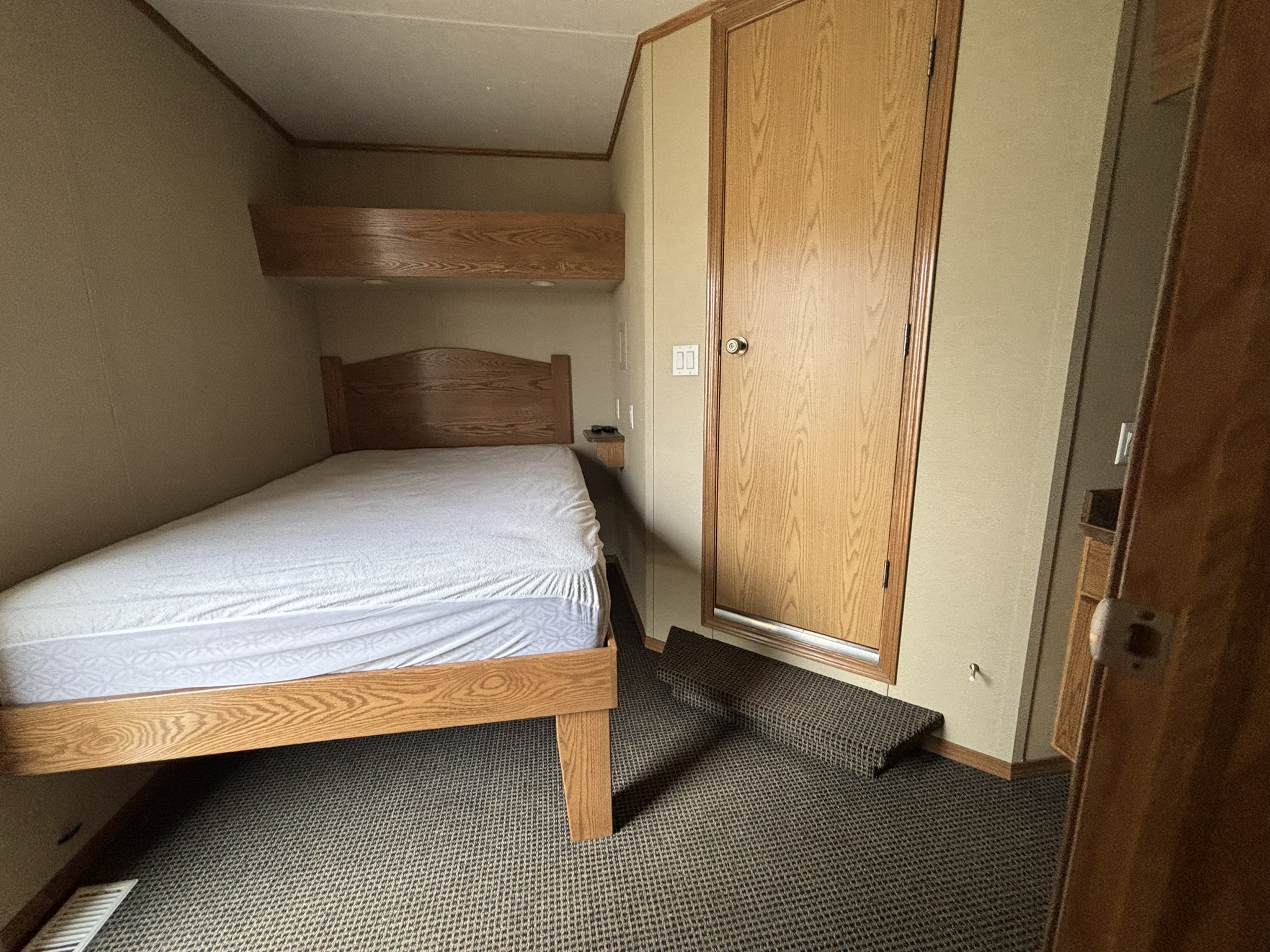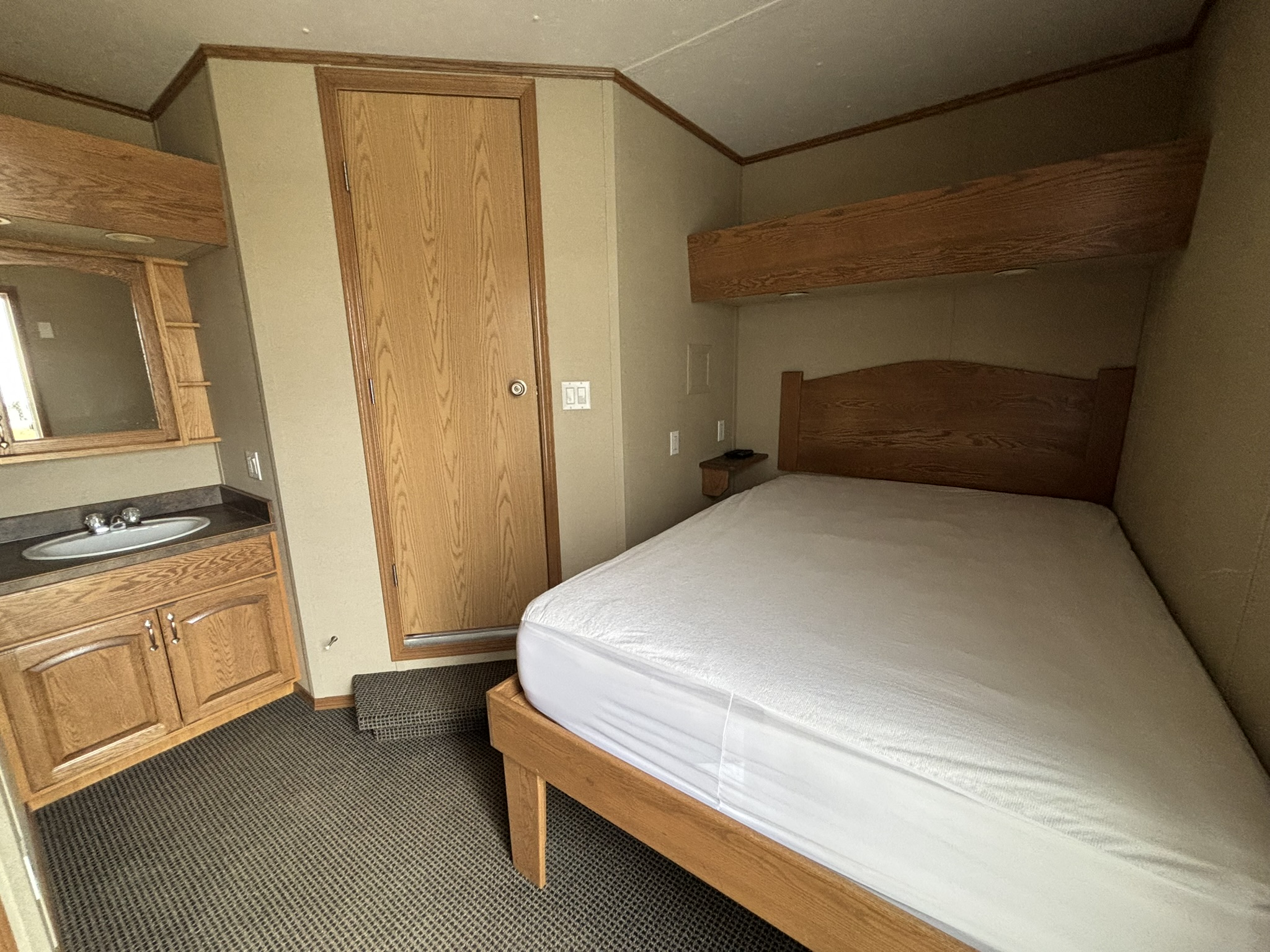 This 2011 “Gateway Portable Accommodation Trailer” shows very well. The mechanical room has 400 gallon fresh water tank, hot water tank, water pump furnace, laundry center, central vacuum and forced air propane furnace with a/c.